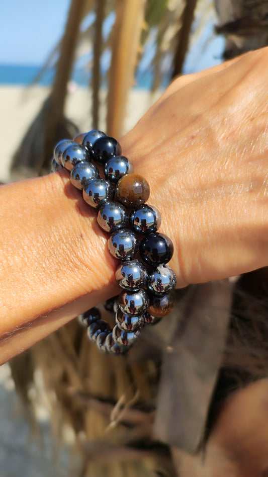 Bracelet Trois pierres Oeil du Tigre Hématite Obsidienne .